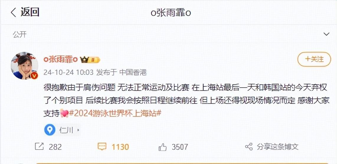 張雨霏首先表達道歉,直言很抱歉因爲肩傷的問題,無法正常運動和比賽了,自己在上海站最後一天,以及這次在韓國仁川站的第一天,她都不得不棄權個別項目。
