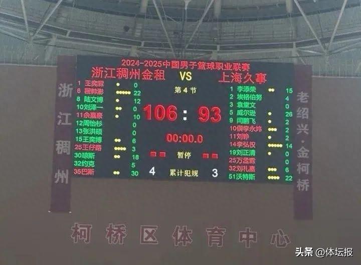 10月28日,CBA聯賽,浙江稠州金租男籃主場迎戰上海男籃,最終浙江男籃以106:93戰勝上海男籃。