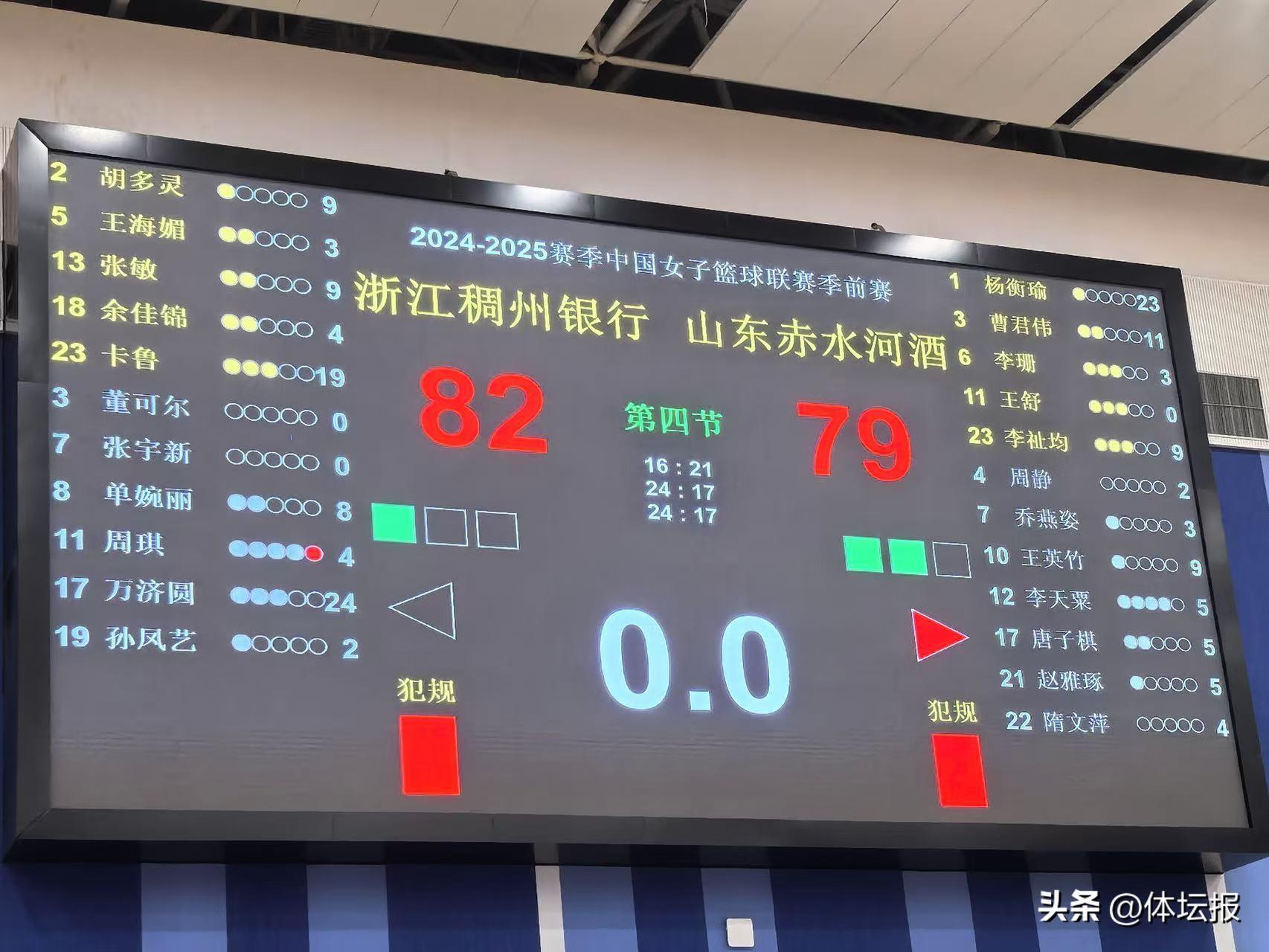 浙江稠州銀行女籃首場比賽對陣山東赤水河酒女籃。此役浙江女籃開局慢熱,首節16-21落後,第二節逐漸開始調整狀態,奮起直追,上半場結束,浙江女籃40-38領先。易邊再戰,兩隊打得難解難分,浙江女籃利用對方失誤在第四節末打出了反擊,山東女籃則緊咬比分,讓比賽懸念一直保留到最後,最終浙江女籃頂住壓力,以82-79險勝對手。