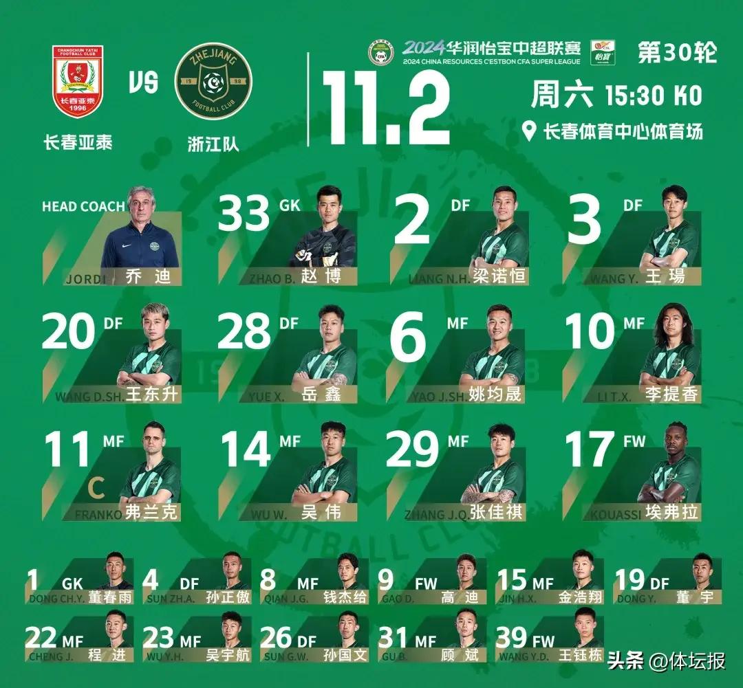 11月2日,2024賽季中超聯賽進入最後一輪的比賽爭奪。本輪比賽,浙江隊遠赴東北,與長春亞泰展開對決。最終,雙方以2:2打平的結果,結束了各自的2024賽季。
