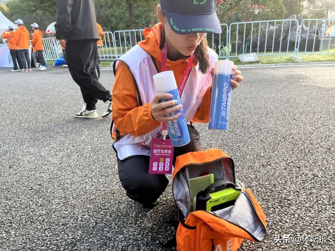 AED急救員們揹着橙色的AED包待命,AED急救員和頁來自阿里急救先鋒急救俠,向記者展示了包裏的工具,包裏有:小毛巾,一臺AED,兩瓶運動降溫噴霧。參加過多次杭馬AED的志願者工作的她提醒大家:“距離終點4公里是意外高發處,希望大家都能夠安全完賽,希望用不上我的技能”。