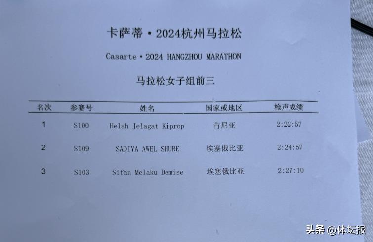 男子前三均打破杭州馬拉松賽會紀錄,女子第一第二打破杭州馬拉松賽會紀錄,最終成績以賽事總管簽字爲準。