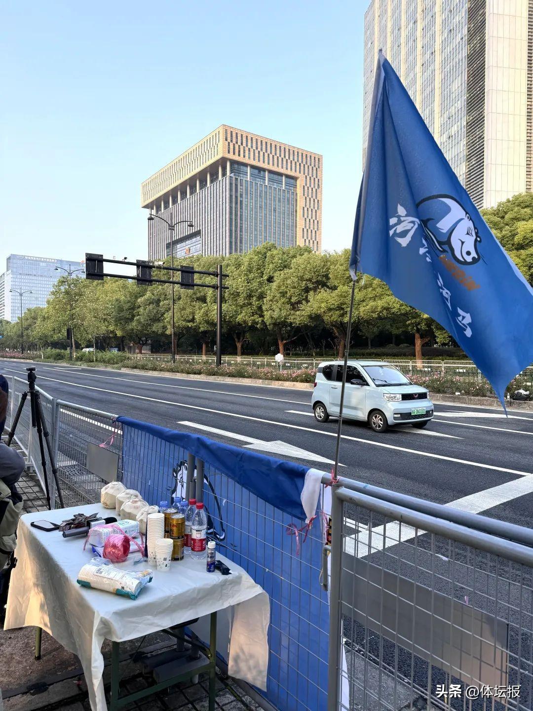 河濱之城河馬跑團的成員們已經在這裏等候多時,據跑團成員陸國偉介紹,跑團在本次杭馬18公里和31公里設置了補給點,18公里補給點有3個大人;31公里有3個大人,2個小孩。