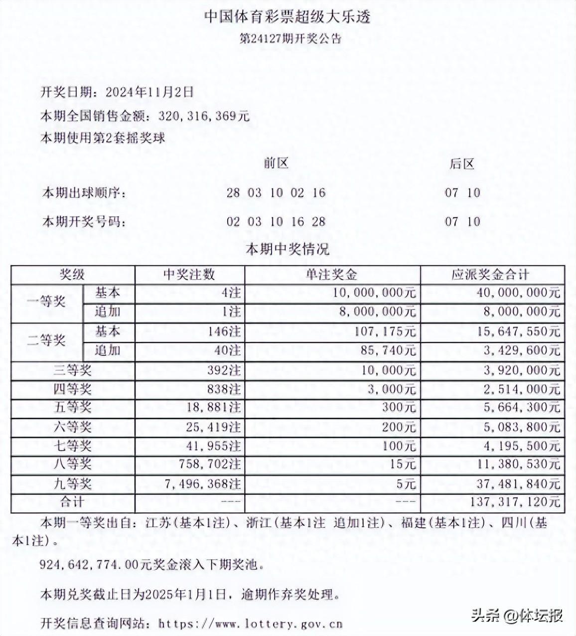 11月2日,超級大樂透第24127期開獎。前區開出號碼02、03、10、16、28;後區開出號碼07、10。杭州購彩者中得1注追加一等獎。本期全國銷售3.2億元,爲國家籌集彩票公益金1.15億元。來源:中國體彩報