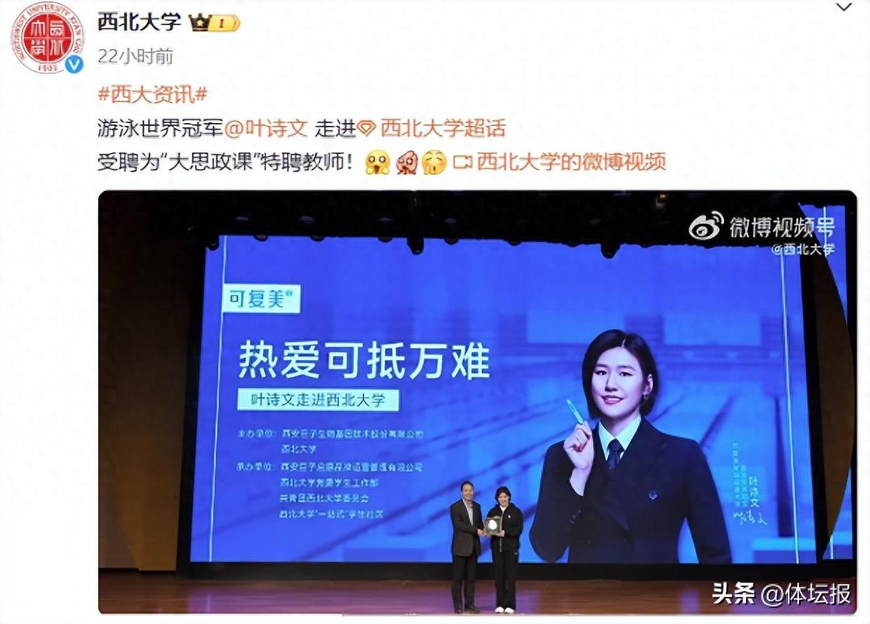 11月3日,西北大學發佈消息:游泳世界冠軍葉詩文受聘爲西北大學“大思政課”特聘教師。當日,葉詩文在名爲“熱愛可抵萬難”的分享會上講述了在清華求學時的經歷,也回顧、分享了十餘年運動生涯中自己面對挫折的經驗和體會。她說:“如果暫時沒有尋找到自己特別擅長的領域,則要學着多去嘗試。人生就是一個不斷試錯的過程,千萬不要害怕失敗。”來源:西北大學官微、中國婦女報