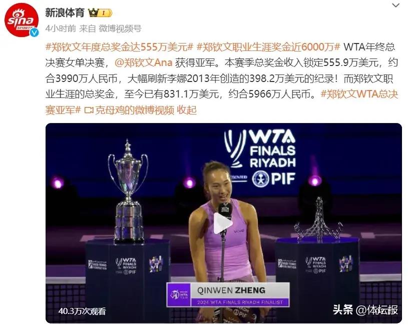 當地時間11月9日晚,在沙特阿拉伯利雅得進行的2024年女子網球選手協會(WTA)年終總決賽單打決賽中,經過三小時的鏖戰,中國“一姐”鄭欽文1:2不敵2023年美網冠軍高芙,職業生涯首次參賽即奪得亞軍,追平了李娜在2013年創造的亞洲球員在該賽事的單打最佳戰績。