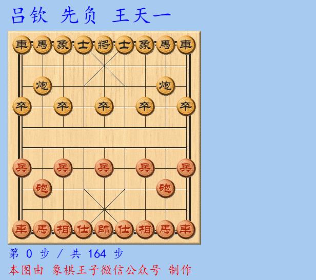 王天一抓住機會發炮打將,揮車再將,把紅棋陣型打亂,呂欽匆忙應對,164手敗下陣來。