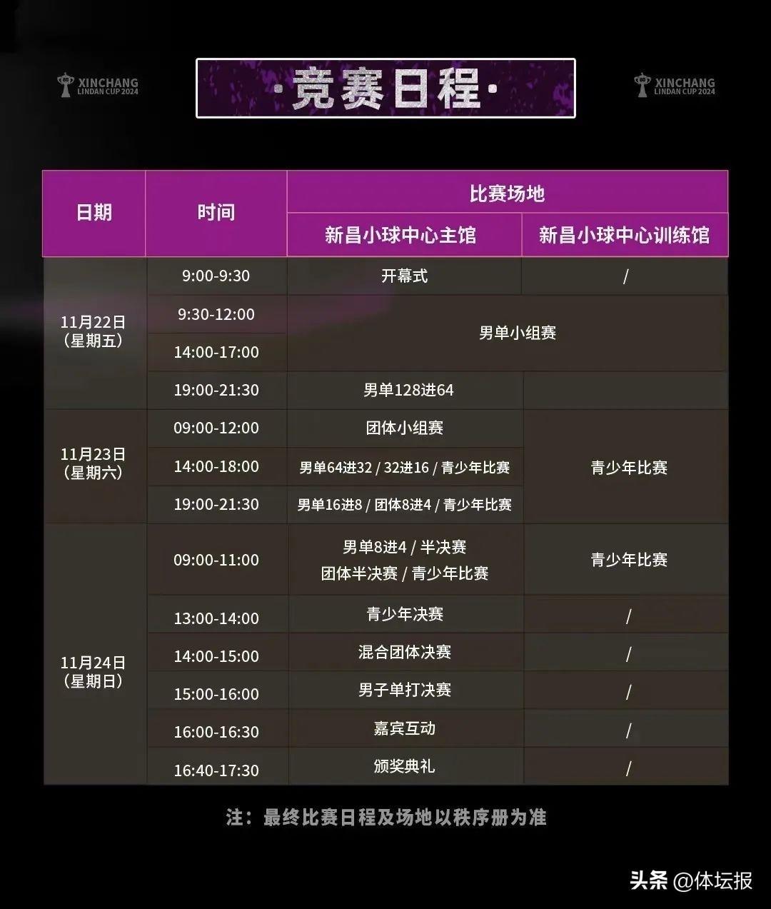 2024新昌“林丹杯”羽毛球公開賽將於11月22日至24日在新昌小球中心舉行。本次賽事迎來重磅升級,旨在爲全世界各地的羽毛球愛好者們帶來一場羽球盛宴。