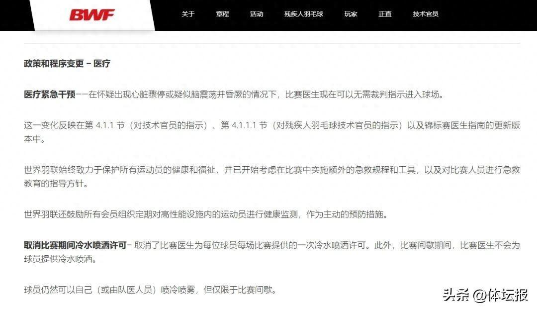 近日,世界羽聯理事會召開會議,就部分比賽規則進行調整。在目前已公佈的新規則中,就包含了關於醫療方面的規定,比如在懷疑出現心臟驟停或疑似腦震盪、暈厥等緊急情況時,比賽醫生無需裁判指示就可以直接進入賽場進行干預治療。同時,世界羽聯也鼓勵所有會員組織定期對運動員進行健康監測,以主動預防可能出現的傷病情況。
