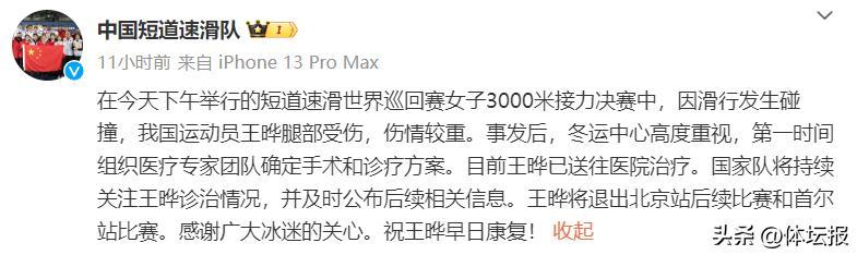 賽後,中國短道隊也更新了傷情,中國選手王曄腿部受傷,傷情較重,冬運中心第一時間組織醫療專家團隊確定手術和診療方案,目前王曄已被送往醫院治療。她將退出北京站後續比賽和下一站首爾站的比賽。