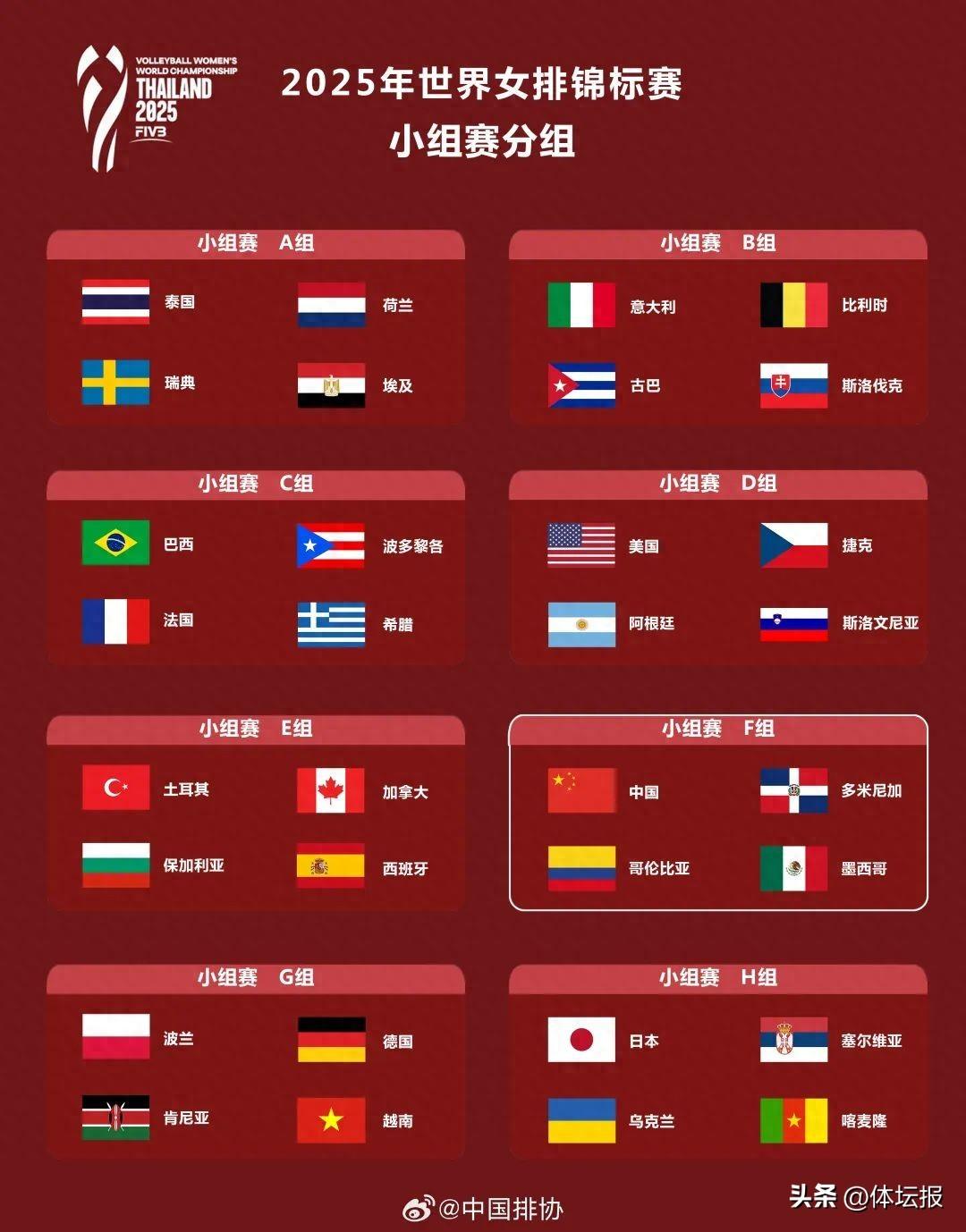 北京時間12月17日,2025年女排世錦賽小組抽籤儀式在泰國舉行,中國女排與多米尼加、哥倫比亞、墨西哥分在F組。根據賽制,32支球隊分成8個小組,每組4支球隊。每個小組先進行組內單循環賽,小組前二的球隊晉級16強淘汰賽,之後再交叉進行淘汰賽,直至決出冠軍。按照計劃,比賽將於2025年8月22日至9月7日在泰國四個城市清邁、普吉、呵叻、曼谷進行。來源:@中國排協、央視體育