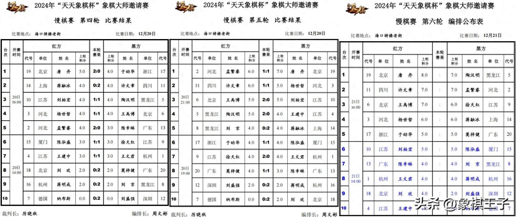 大賽21日上午兩點,下午七點進行慢棋資格賽第6、7輪的單項終極戰鬥,一姐唐丹能否領先全場,奪取慢棋第一,衆位男子英豪新銳會否反轉乾坤,拭目以待,象棋王子也將繼續進行全程的直播和報道,敬請關注、支持、守護,謝謝!