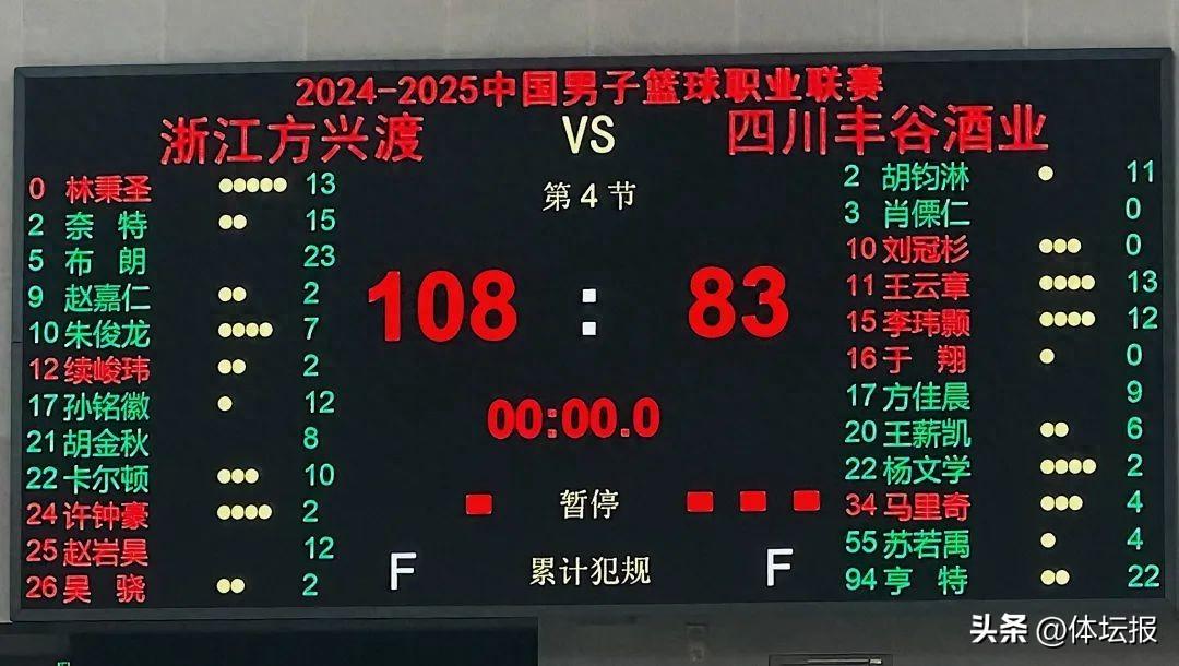 12月26日晚,浙江方興渡時隔半個月重回黃龍主場,迎來了本賽季常規賽與四川豐谷酒業的第三次交鋒。最終,方興渡108:83輕取對手,依舊保持常規賽主場不敗。本場方興渡進入大名單的12位球員均有得分入賬,其中6人得分上雙,布朗砍下全場最高的23分11助攻,奈特貢獻15分,迎來生日的林秉聖拿下13分;四川4人得分上雙,亨特空砍全隊最高的22分。