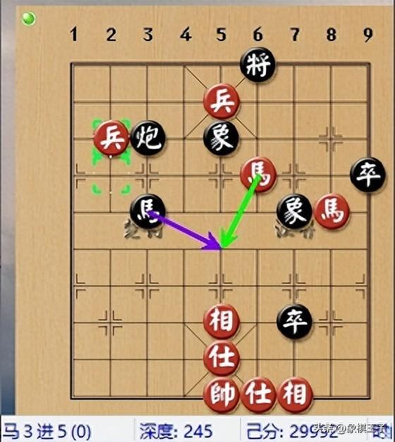 紅佈陣快速藉機渡過三路兵,隨後在糾纏中,簡化成馬炮四兵仕相全對雙炮3卒士象全的多兵,兵種好局面。