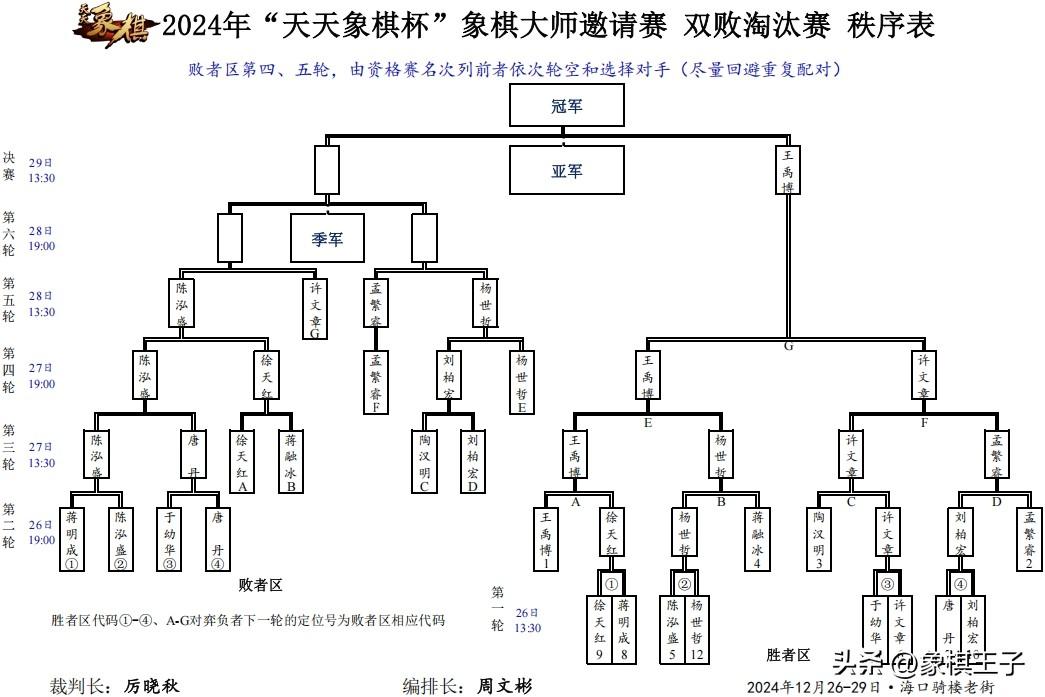 此次天天象棋杯,在淘汰賽的廝殺中,採取最爲猛烈的雙敗淘汰制戰法,在敗者區中,贏的留,輸的回,十分殘酷。