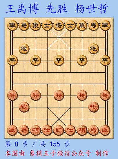 最終155手,紅馬炮兵仕相全對黑馬炮卒雙象,紅宮心兵威力太大,即要成殺,黑無法再守,楊世哲投子認負。