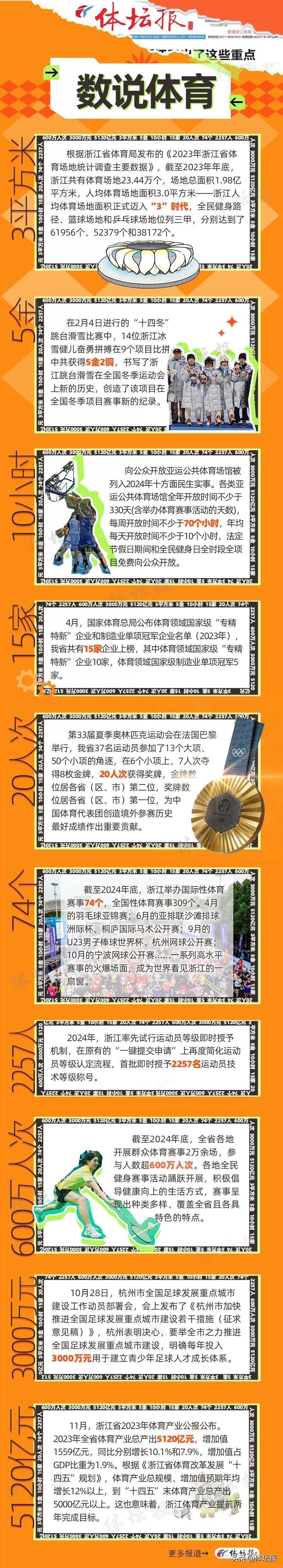 2024年是浙江的“後亞運元年”。亞運聖火緩緩熄滅後,在浙江這片熱土上,體育的激情與夢想未隨之消散,而是在燃燒中照亮了浙江體育高質量發展的未來之路。人均體育場地面積3.0平方米、巴黎奧運會獎牌數位居各省(區、市)第一位、全省體育產業總產出5120億元……讓我們在一組組數據中,感受浙江體育澎湃活力。