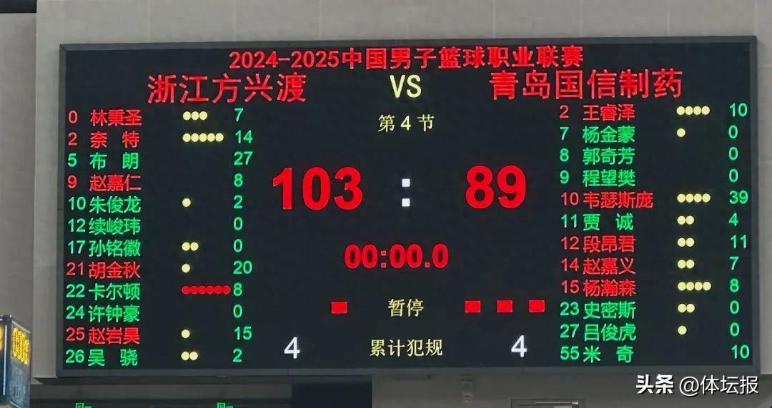 此役,方興渡四人得分上雙,布朗拿下全隊最高的27分,胡金秋貢獻20分,趙巖昊得到15分;青島也是四人得分上雙,韋瑟斯龐空砍全場最高的39分。