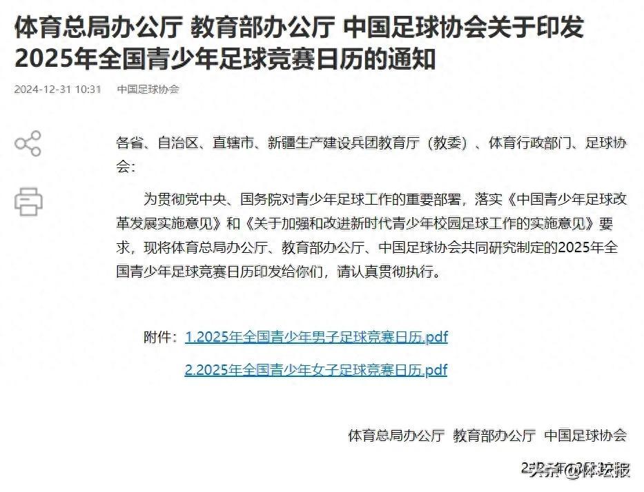 近日,體育總局辦公廳、教育部辦公廳和中國足協發佈了《關於印發2025年全國青少年足球競賽日曆的通知》。三部門聯合發佈,尚屬首次,迎來了中國青少年賽事治理的里程碑。