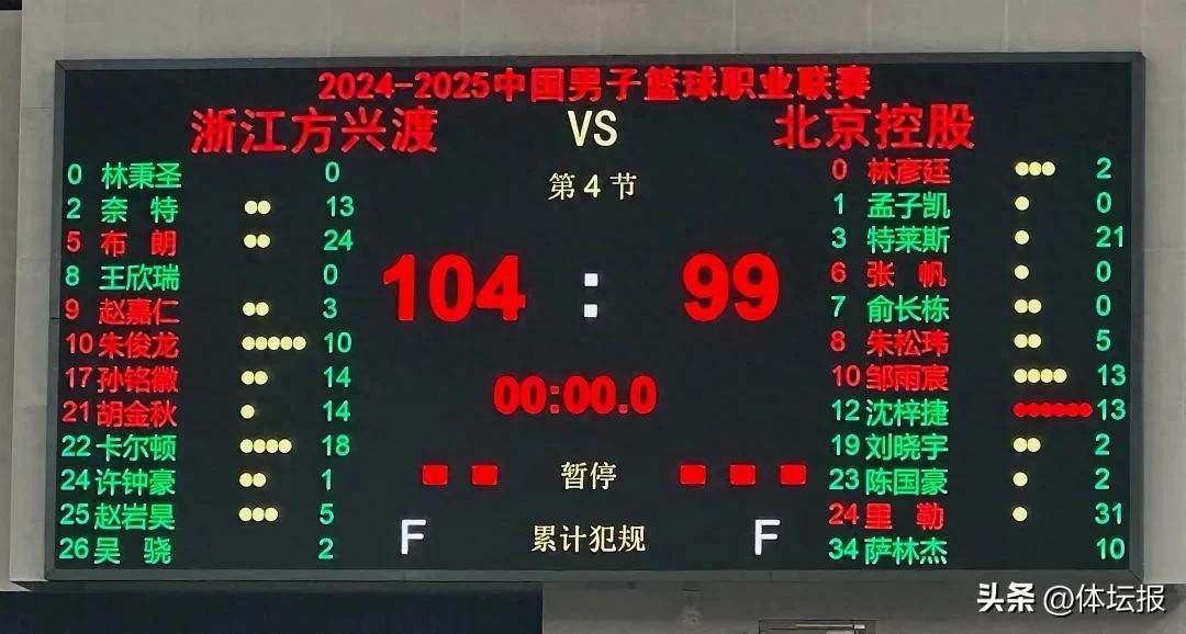 在鄒雨宸和特萊斯的帶領下,北控在進攻端逐漸找回感覺,分差一度被縮小至4分。此後,方興渡果斷加強了對內線的衝擊,沈梓捷領到五犯後不得不下場休息。胡金秋和卡爾頓連續二次進攻得手,終場前4分47秒,沈梓捷犯滿離場,北控內線的防守壓力進一步增大。