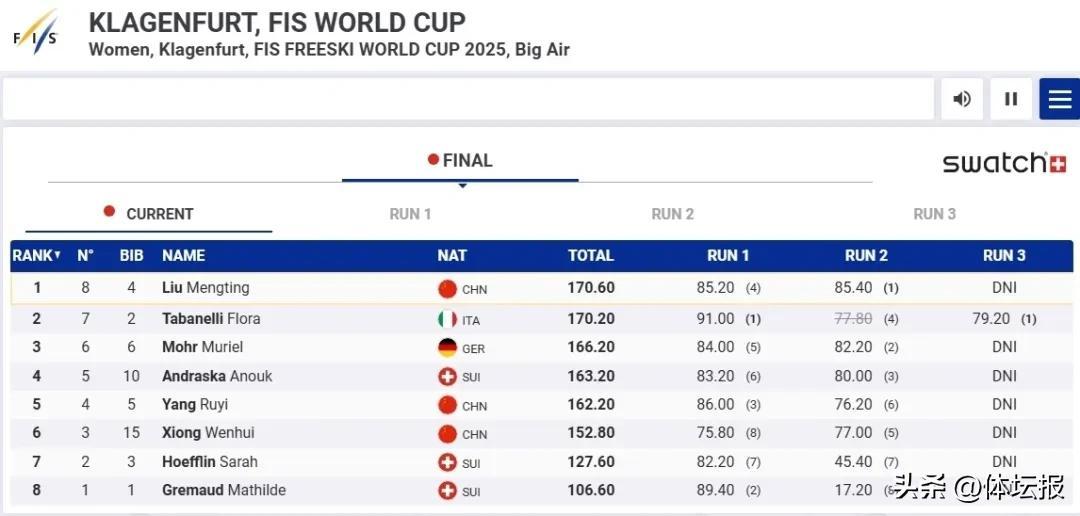 值得一提的是,20歲的劉夢婷上賽季在自由式滑雪大跳臺世界盃法國蒂涅站,以總分170.75分獲得女子項目銀牌首次獲得世界盃賽事獎牌之後,第二次登上世界盃領獎臺。