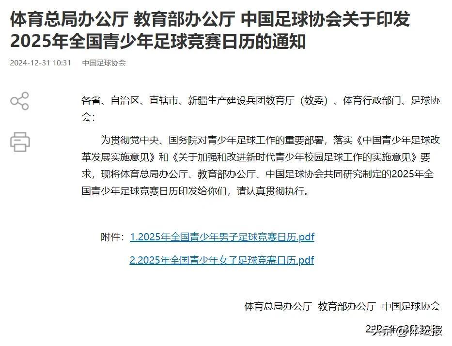 除了打通培養路徑,在青少年足球人才的培養方面,有充足的比賽磨鍊非常關鍵,這個年齡段是孩子們“漲球”的最佳時機,更多高質量的比賽,能幫助他們提升技術運用和戰術理解等方面的能力。前不久,國家體育總局辦公廳、教育部辦公廳和中國足協聯合發佈的2025年全國青少年足球競賽日曆,標誌着中國足球青訓工作的又一重要進展,也體現了國家對青少年足球事業的重視,以及在全民健身和青少年體育教育上所作出的努力。此舉不僅能有效提高青少年參與足球運動的積極性,還將進一步促進校園足球和職業俱樂部之間的互動,形成良性循環。