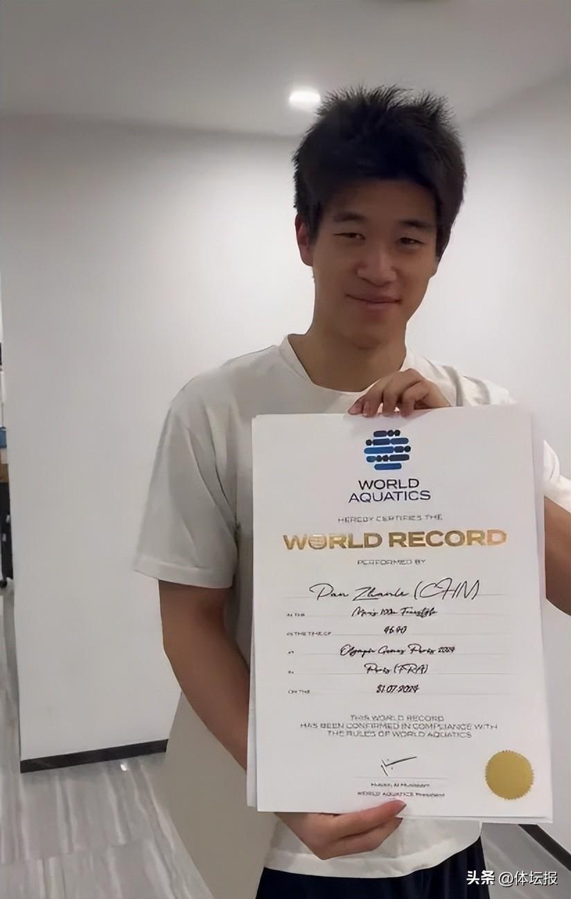 2024年9月10日,奧運冠軍潘展樂發佈視頻,向網友展示了游泳世界紀錄證書。潘展樂拆開快遞包裝,從中拿出一份世界紀錄證書,上面用英文寫着,潘展樂在巴黎奧運會創造了男子100米自由泳世界紀錄,時間爲46秒40。潘展樂在展示證書時,也不忘“凡爾賽”一波,表示自己已經拿到兩個了,“已經不稀有了,上面的數字才稀有。”此前,潘展樂在2024年2月的多哈游泳世錦賽上以46秒80的成績刷新世界紀錄。奧運會上再次提高世界紀錄的門檻,《世界游泳》稱他“重新定義了成功的標準”。
