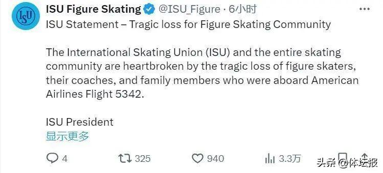 國際滑冰聯盟(ISU)當日發表聲明表示,聯盟和全球滑冰界對這起悲慘事故深感震驚——