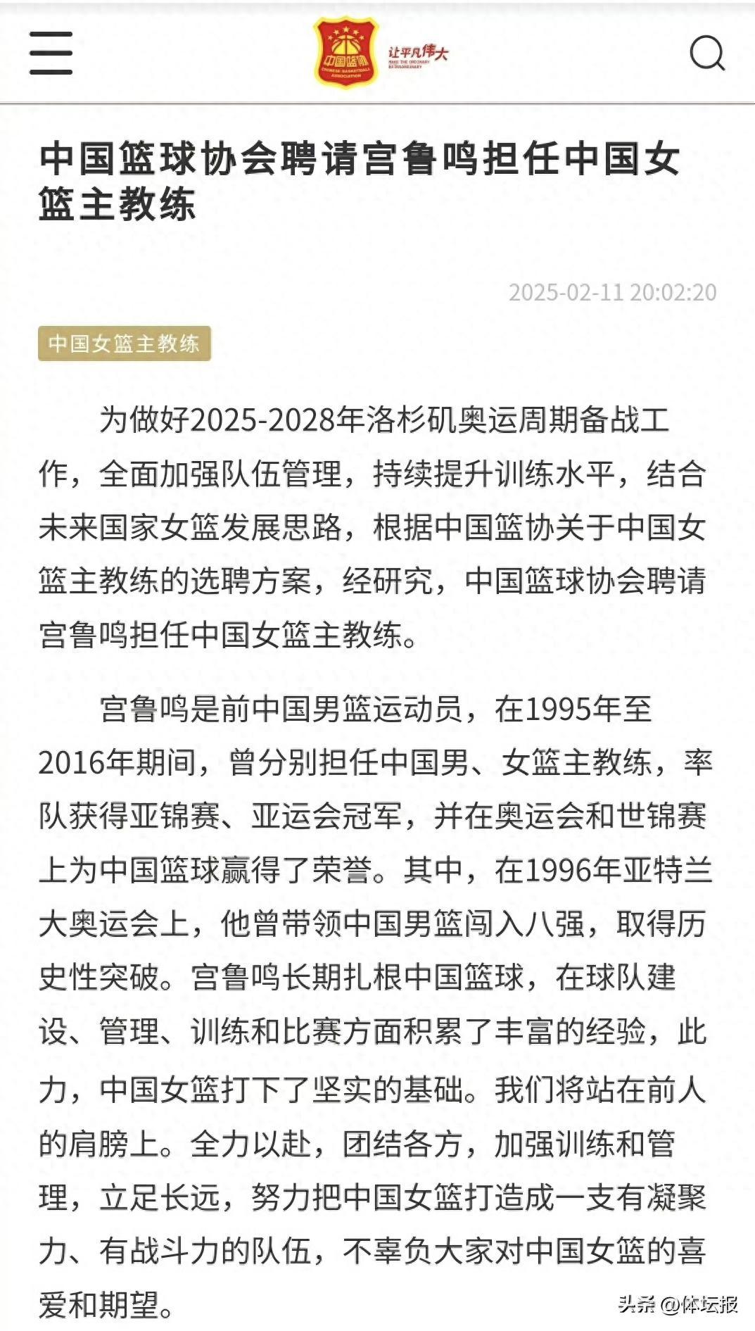 2月11日晚,中國籃球協會發文官宣將由宮魯鳴擔任中國女籃主教練。