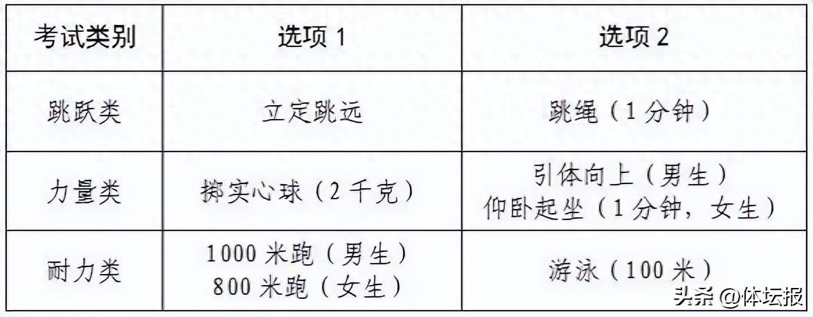 今年杭州體育中考依然和去年一樣,採用“6選3”的方式。6個項目分別爲:立定跳遠、跳繩(1分鐘)、擲實心球(2千克)、引體向上(男生)/仰臥起坐(1分鐘,女生)、1000米跑(男生)/800米跑(女生)、游泳(100米)。考生在跳躍類、力量類、耐力類3個考試類別中,分別選定1個項目作爲考試項目,滿分30分。