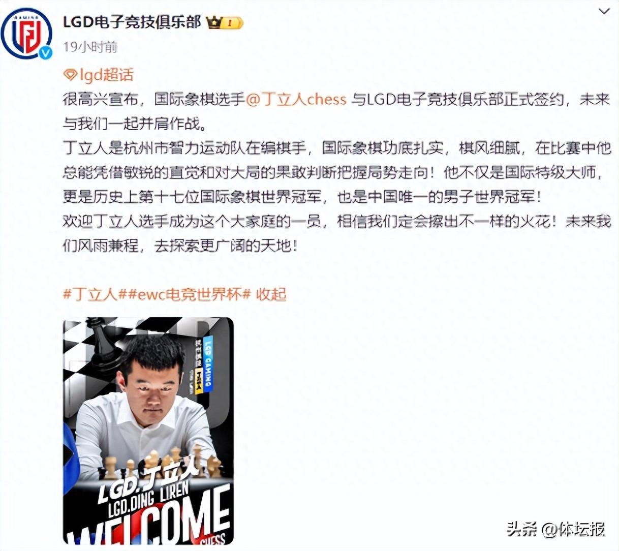2月13日,LGD電子競技俱樂部與國際象棋世界冠軍丁立人通過官方渠道宣佈正式簽約。
