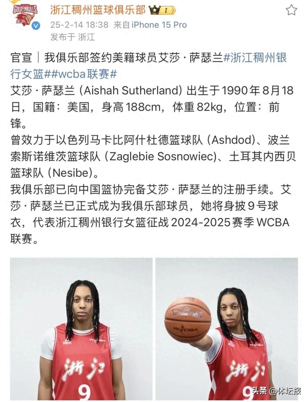 2月14日,浙江稠州籃球俱樂部發文官宣簽約美籍球員艾莎·薩瑟蘭。目前,俱樂部已向中國籃協完備艾莎·薩瑟蘭的註冊手續。艾莎·薩瑟蘭已正式成爲浙江女籃球員,她將身披9號球衣,代表浙江稠州銀行女籃征戰2024-2025賽季WCBA聯賽。