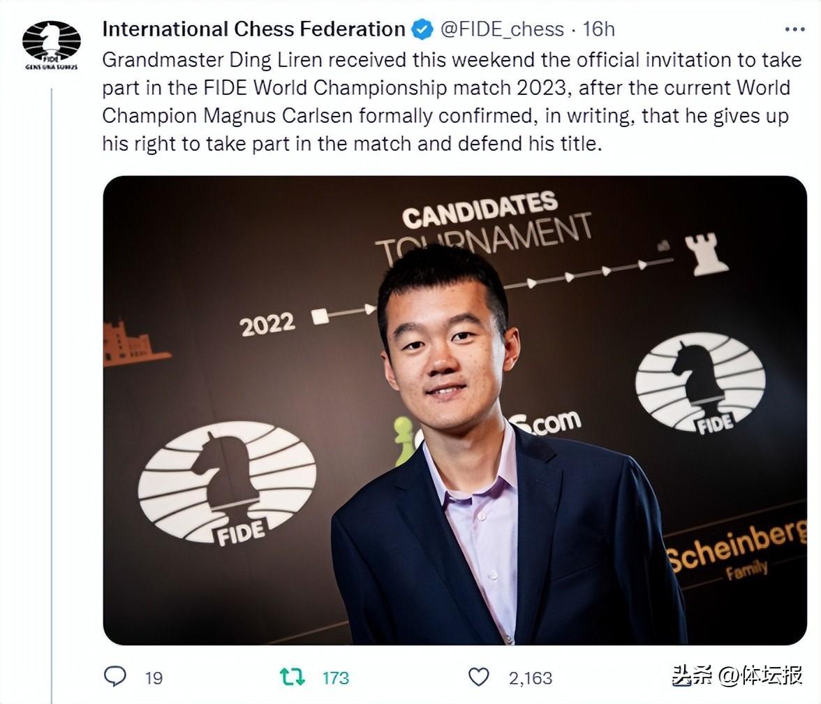 在得到現任世界冠軍馬格努斯·卡爾森放棄捍衛頭銜的正式書面確認後,國際棋聯已於本週向丁立人發出了2023年國際棋聯世界冠軍賽的正式邀請。
