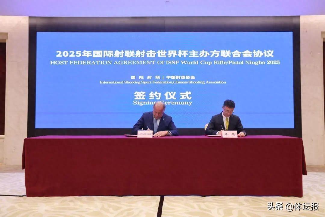 2月18日,2025年國際射聯射擊世界盃簽約儀式在寧波舉行。現場,國際射聯與中國射擊協會簽訂賽事承辦協議,中國射擊協會、浙江省體育局與寧波市人民政府簽訂三方共同承辦賽事協議。