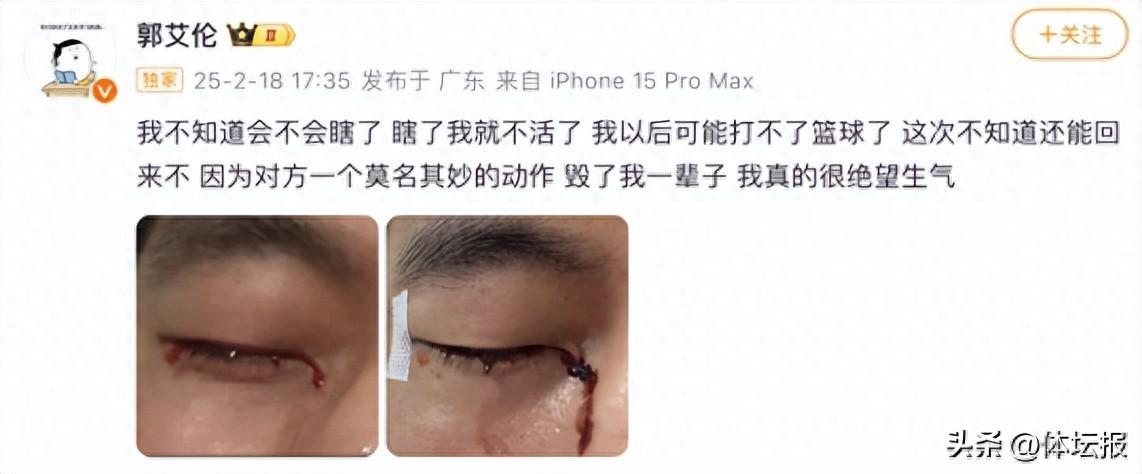 2月18日,知名籃球運動員郭艾倫曬出眼睛受傷流血的照片,“我真的很絕望生氣”。