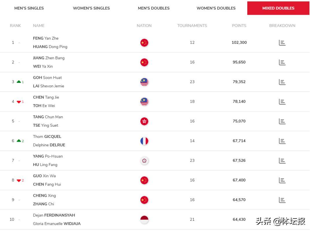 女雙方面,劉聖書/譚寧位居第2,巴黎奧運會後已經不參賽的“凡塵”組合陳清晨/賈一凡依然高居第4,小將李怡婧/羅徐敏位居第7。