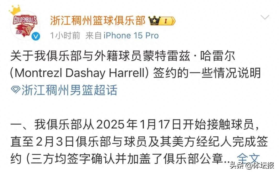 而2月19日上午,網上不斷有哈雷爾又簽約了新疆俱樂部的傳聞。直到2月20日,浙江稠州金租男籃俱樂部正式發佈了關於哈雷爾簽約的情況說明。