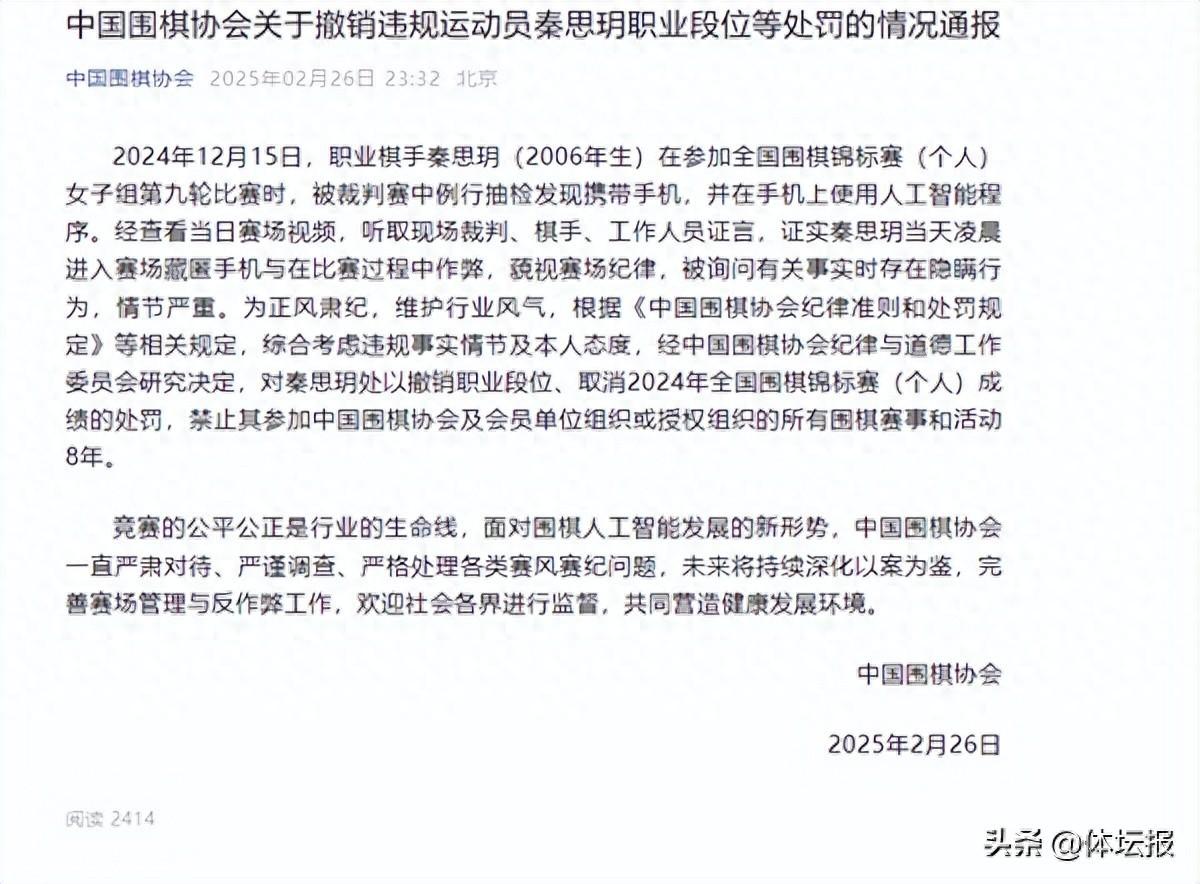 2月26日,中國圍棋協會通報了一起圍棋比賽作弊事件,19歲職業棋手秦思玥(2006年生)因在2024年12月15日舉行的全國圍棋錦標賽(個人)女子組第九輪比賽中,違規攜帶手機並使用人工智能程序作弊,被處以撤銷職業段位、取消比賽成績,並禁止參加中國圍棋協會及會員單位組織或授權組織的所有圍棋賽事和活動8年的處罰。