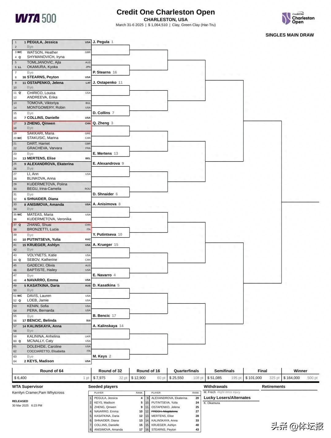 據瞭解,本次賽事共有三位世界Top10球員亮相。排名第四的邁阿密站亞軍佩古拉是女單頭號種子,排名第五的凱斯在澳網奪冠後回到主場,成爲女單2號種子。排名第八的鄭欽文以3號種子身份參賽。