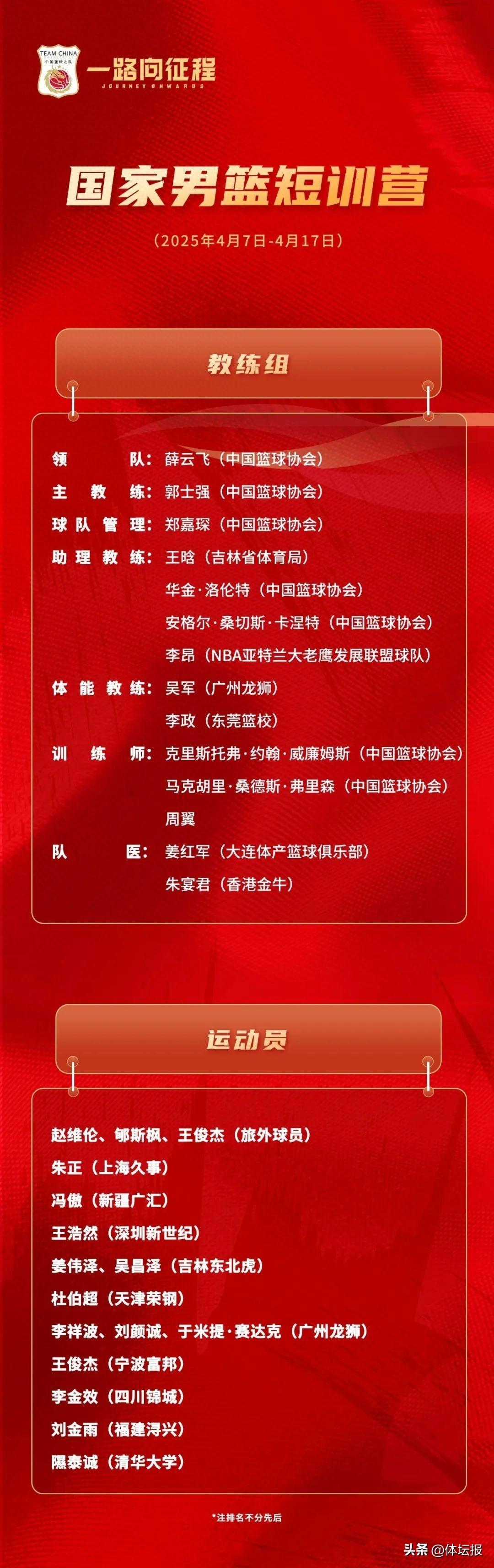 4月1日晚,中國籃協官方公佈了國家男籃短訓營名單。本次男籃短訓營旨在考察年輕運動員,爲2027年男籃世界盃和2028年洛杉磯奧運會做人才儲備。