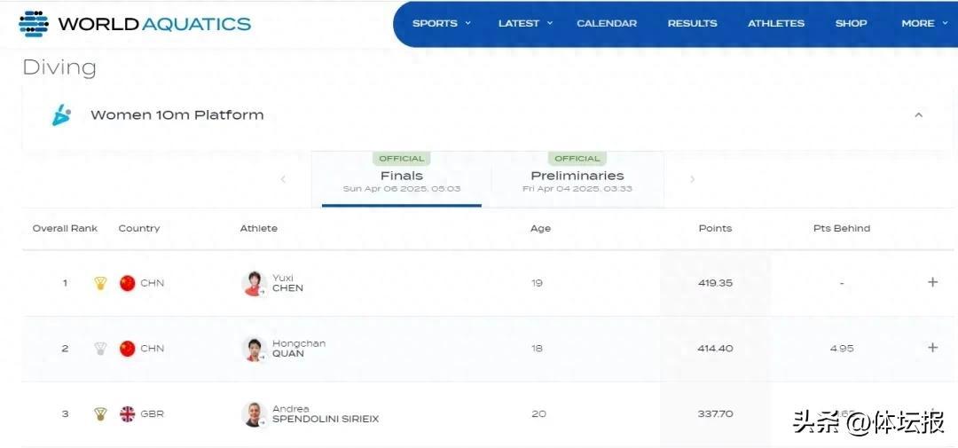 陳芋汐以419.35分的成績奪得冠軍,全紅嬋以414.40分的成績摘得銀牌,英國選手以337.70的成績排名第三。