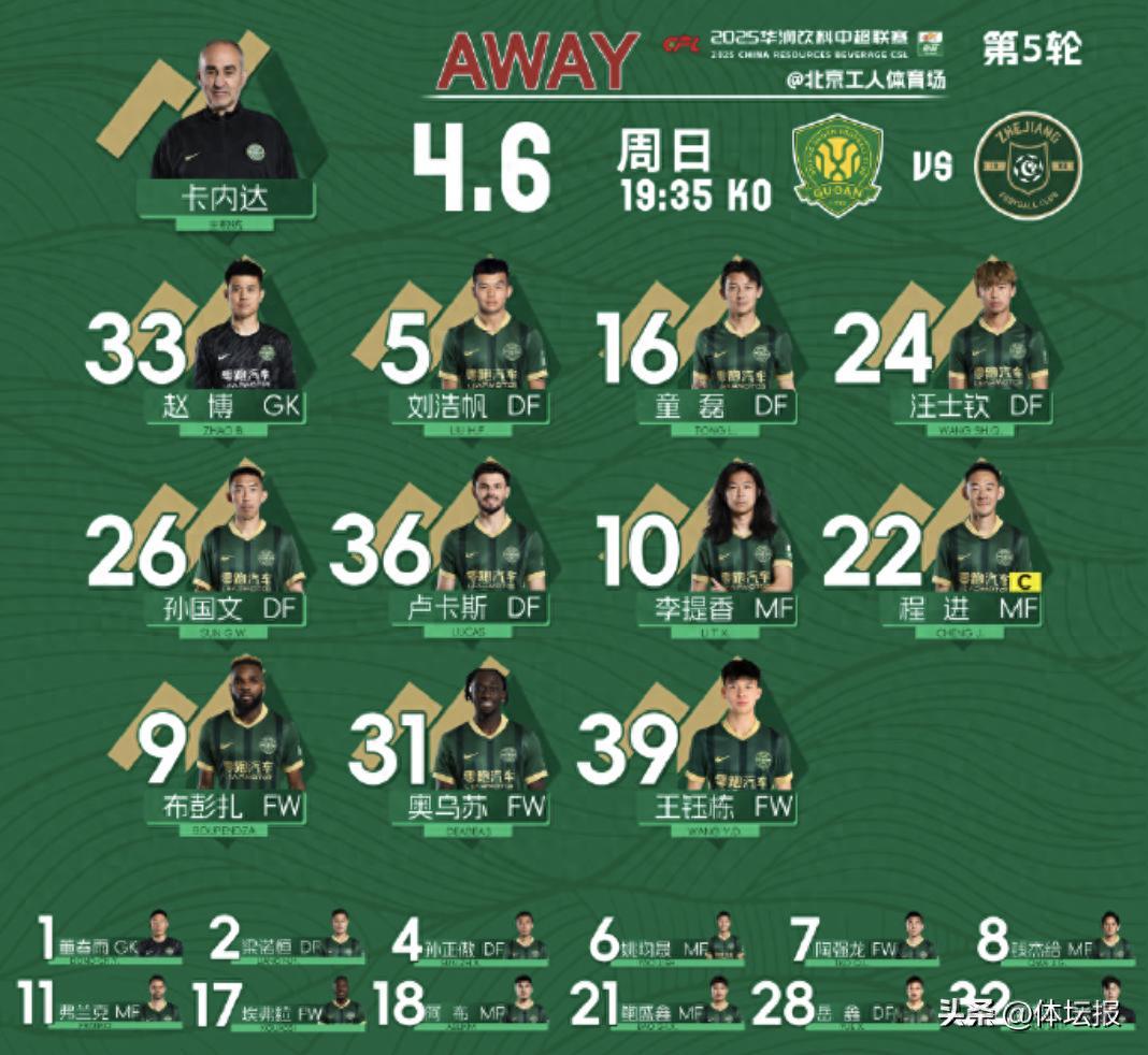 本場比賽,浙江綠城在陣容上依舊延續了前兩輪以年輕球員爲主的陣容,並僅使用三外援與對方的五外援+一歸化對壘,看得出來主教練卡內達對於這套愈發成熟的陣容具有相當的信心。此外,備受球迷矚目的隊長弗蘭克以及埃弗拉也出現在本場比賽的替補席上,將成爲卡內達的後手待機。
