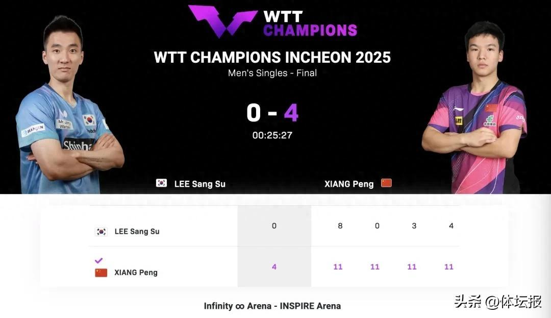 狀態大熱的向鵬在決賽遇上了主場作戰的李尚洙,現場觀衆爲對手的加油聲讓他更具動力,他也把自己的狀態全部拉滿:正手進攻殺傷力十足,第一局開局落後成功逆轉,以11:8取勝,第二局更是自信爆棚打出駭人的11:0,第三局11:3,第四局11:4,摧枯拉朽般的攻勢,也讓現場的韓國觀衆越來越安靜。
