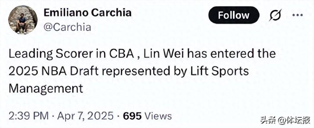 據歐洲籃球名記Emiliano Carchia報道,21歲的中國球員林葳將報名參加2025年NBA選秀。