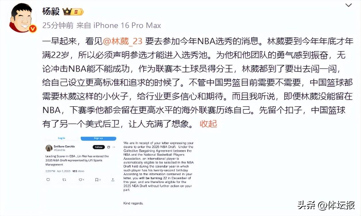 隨後據國內媒體消息,林葳本人已經收到了來自於NBA官方的郵件回覆,確認他自動獲得2025年NBA選秀大會參選資格,而林葳也將在下個月前往美國特訓。