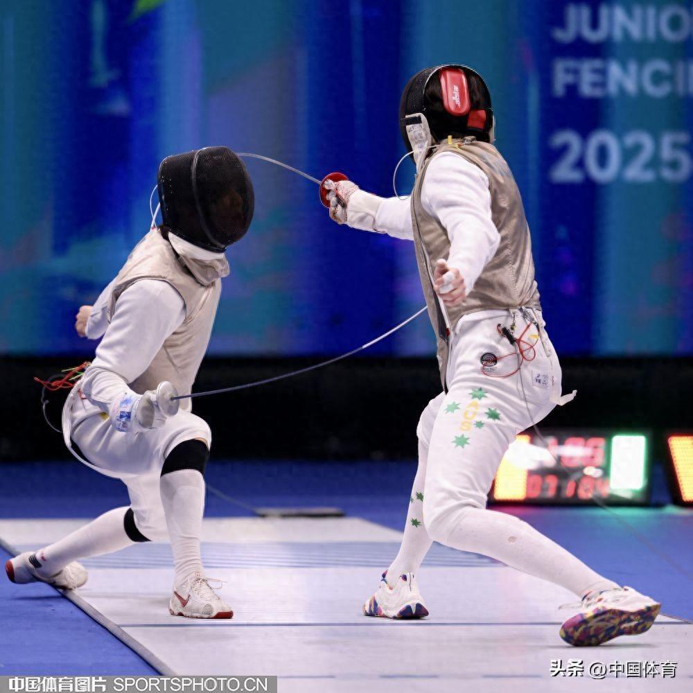 中國體育訊 4月10日,2025年世界青少年擊劍錦標賽在江蘇無錫太湖國際博覽中心進入第四個比賽日。在青年男子花劍1/8決賽中,中國選手郭一凡15比9擊敗澳大利亞選手格拉森·約瑟夫,晉級八強。圖爲郭一凡(左)在比賽中。(中國體育圖片 張昕 攝)