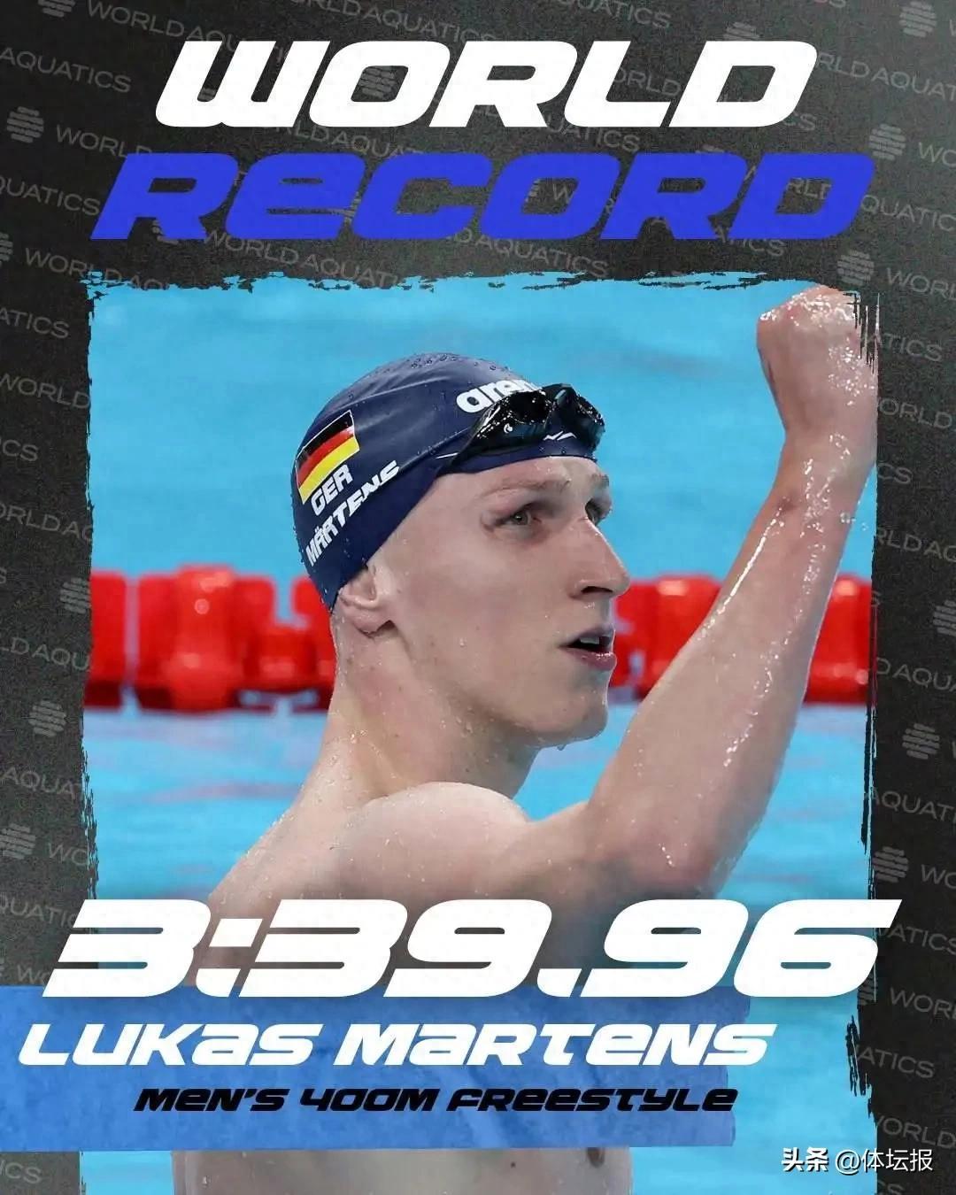 北京時間4月13日凌晨,斯德哥爾摩游泳公開賽男子400米自由泳比賽中,23歲的德國選手馬滕斯以3分39秒96的成績,打破該項目的世界紀錄!此前的世界紀錄(3分40秒07)由其同胞比德爾曼在2009年的羅馬世錦賽創造。