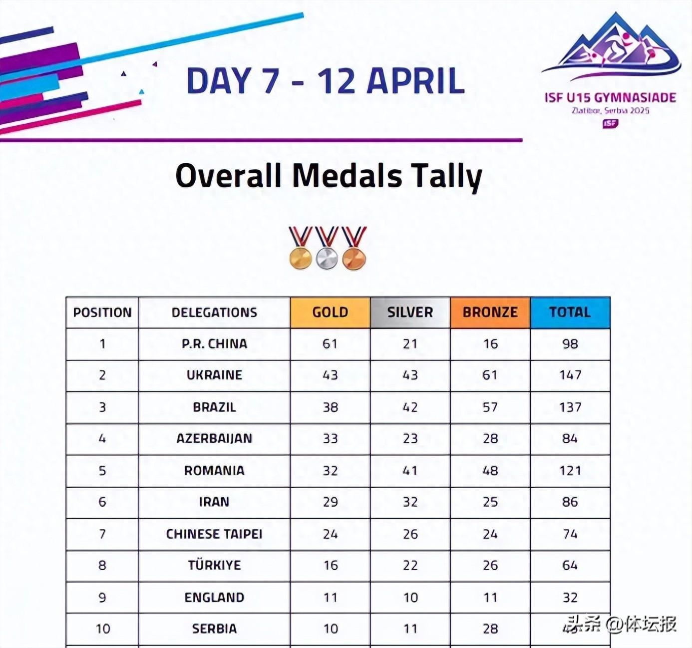 北京時間4月13日,國際中學生體育聯合會公佈了剛剛落幕的2025年U15世界中學生夏季運動會金牌榜,中國中學生體育代表團以61金21銀16銅的優異成績排名第一。