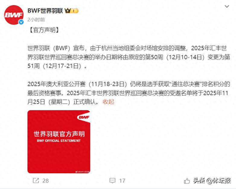 4月18日,世界羽聯(BWF)宣佈,由於杭州當地組委會對場館安排的調整,2025年匯豐世界羽聯世界巡迴賽總決賽的舉辦日期將由原定的第50周(12月10-14日)變更爲第51周(12月17-21日)。