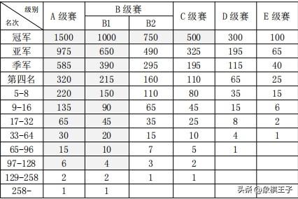 分別對應的,A級賽冠軍1500積分,B級賽,B1類冠軍1000積分,B2類冠軍750積分,C級賽冠軍500積分,D級賽冠軍300積分,E級賽冠軍100積分。